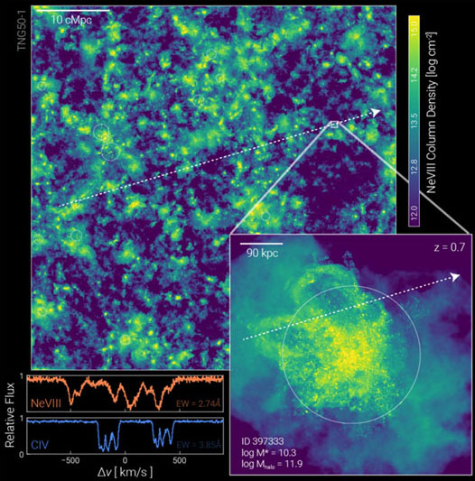 [arXiv] We explore the abundance, spatial distribution, and physical properties of the OVI, OVII, and OVIII ions of oxygen in circumgalactic and intergalactic media (the CGM, IGM, and WHIM). We use the TNG100 and TNG300 large volume cosmological magneto-hydrodynamical simulations. Modeling the ionization states of simulated oxygen, we find good agreement with observations of the low-redshift OVI column density distribution function (CDDF), and present its evolution for all three ions from z=0 to z=4. Producing mock quasar absorption line spectral surveys, we show that the IllustrisTNG simulations are fully consistent with constraints on the OVI content of the CGM from COS-Halos and other low redshift observations, producing columns as high as observed.